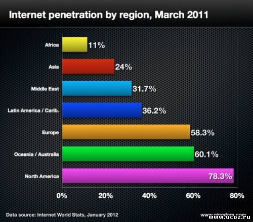 ![]() Самый популярный твиттер в 2011 году — у Леди Гаги, самый дорогой домен был продан за 2,6 миллиона долларов. Шведский аналитический портал Pingdom.com сделал уникальную подборку статистических данных всемирной паутины за 2011 год. 3 146 000 000 (3,1 млрд.) — количество учетных записей электронной почты по всему миру. 27,6% - Самый популярный почтовый клиент это Microsoft Outlook. 19% — количество спама в электронной почте, который проходит в корпоративные почтовые ящики, несмотря на множество спам-фильтров. 112 – Среднее количество сообщений в день, отправленных и полученных в расчете на одного корпоративного пользователя. 71% — в количественном выражении процент спама в международном трафике электронной почты (ноябрь 2011 года). 360 миллионов — общее количество пользователей почтового сервиса Hotmail (крупнейший email сервис в мире). $ 44,25 – по некоторым оценкам, такова отдача от $1, инвестированного в маркетинг по электронной почте в 2011 году. 40 лет – в прошлом году у службы «электронная почта» случился юбилей. Первое письмо было отправлено в 1971 году. 0,39% — от общего почтового трафика — столько писем было заражено вирусами и прочими вредоносами (ноябрь 2011 года). Сайты 555 000 000 (555 млн.) — Столько сайтов существует в мировом Интернете (декабрь 2011 года). 300 миллионов веб-сайтов при этом были созданы в 2011 году. Веб-серверы 239,1% — рост числа сайтов на платформе Apache в 2011 году. 68,7% — рост числа сайтов на IIS. 34,4% — рост числа сайтов на NGINX. 80,9% — рост числа сайтов на различных платформах Google. ![]() Доменные имена 95 500 000 (95,5 млн.) — количество доменных имен зарегистрированных на конец 2011 года в зоне «com». 13 800 000 (13,8 млн.) — доменов в зоне «net». 9 300 000 (9,3 млн.) — доменов в зоне «org». 7 600 000 (7,6 млн.) — доменов в зоне «info». 2 100 000 (2,1 млн.) — доменов в зоне «biz». 220 миллионов – Общее количество зарегистрированных доменных имен (3 квартал, 2011). 86 900 000 (86,9 млн.) — количество доменов в национальных зонах (типа .CN, UK, DE, и т.д.) (Q3, 2011). 324 – Общее количество доменов первого уровня. 28% — доля рынка наиболее распространённой реализации DNS-сервера BIND. На втором месте UltraDNS. $2,6 млн – рекордная цена, по которой был продан домен social.com, самое дорогое доменное имя 2011 года. Интернет пользователи 2 100 000 000 (2,1 млрд.) — Интернет-пользователей по всему миру. 922 200 000 (922,2 млн.) — Интернет-пользователей в Азии. 476 200 000 (476,2 млн.) — Интернет-пользователи в Европе. 271 100 000 (271,1 млн.) — Интернет-пользователей в Северной Америке. 215 900 000 (215,9 млн.) — Интернет-пользователей в Латинской Америке (Карибском бассейне). 118 600 000 (118,6 млн.) — Интернет-пользователей в Африке. 68 600 000 (68,6 млн.) — Интернет-пользователи на Ближнем Востоке. 21 300 000 (21,3 млн.) — Интернет-пользователей в Австралии и Океании. 45% — Интернет-пользователей в возрасте до 25 лет. Интернет молод, да. 485 000 000 (485 млн.) — Интернет-пользователей в Китае. Самое большое количество интернетчиков в Мире. 36,3% — проникновение Интернета в Китае. 591 000 000 (591 млн.) – пользователей, подключеных к Интернет по фиксированным (проводным) широкополосным каналам передачи данных. Что составляет 28,1% всех пользователей. ![]() Социальные сети 800 млн. (и больше) — Количество пользователей Facebook к концу 2011 года. 200 млн. — Число новых пользователей Facebook, которые были зарегистрированы в течение 2011 года. 350 миллионов — пользователи Facebook, которые используют для доступа мобильный телефон. 225 миллионов — Количество пользователей Twitter. 100 миллионо