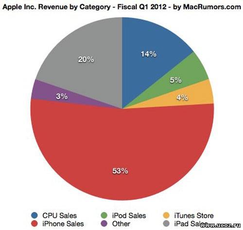 ![]() Компания установила рекорд на рынке по доходам и продажам за первый финансовый квартал 2012 года. (Период длился 14 недель и завершился 31 декабря прошлого года). Продано 5,200 миллионов компьютеров Macintosh, 37 миллионов iPhone, свыше пятнадцати миллионов плееров. Чистая прибыль увеличилась вдвое по сравнению с прошлым годом, и составила 13,06 миллионов долларов. Общая выручка повысилась на 73 процента и составила 46,33 миллиардов долларов. Для сравнения, годом ранее выручка составляла 26,74 миллиардов долларов. ![]() «Мы в восторге от наших выдающихся результатов и рекордных продаж iPhones, iPad и Mac», — прокомментировал результаты отчета Тим Кук, глава компании Apple. Во втором финансовом квартале компания прогнозирует выручку в размере 32,5 миллиарда долларов. PS. После того, как Apple отчиталась по итогам квартала, стоимость ее акций выросла на 30 долларов. Биржа вчера закрывалась на рекордной отметке — $ 450 за акцию. ![]() Напрасно обучение без мысли, опасна мысль без обучения. © Китайская поговорка