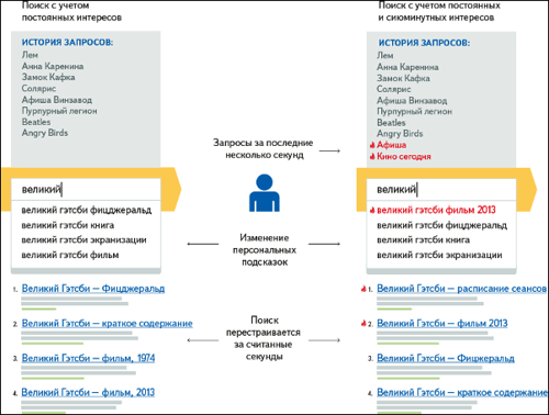 Приходит пользователь к Яндексу и говорит одно слово: [вендетта]. Без контекста невозможно понять, что он ищет. Значение слова? Фильм «V значит ”вендетта”»? Или альбом Земфиры? Конечно, можно ответить наугад, но это же не рулетка. Чтобы дать точный ответ, Яндекс анализирует поисковые интересы пользователя и выдаёт результаты, подходящие именно ему. Эта задача сложнее, чем кажется, ведь интересы пользователей не статичны. Они всё время меняются, и более половины из них живут не больше суток. Яндекс научился учитывать эти сиюминутные интересы на основе недавней поисковой истории пользователя и сразу же адаптировать под них результаты поиска. К примеру, пользователь ищет холодильник. Чтобы не ошибиться с выбором, он читает обзоры и отзывы. Остановившись на холодильниках определённого производителя, он возвращается на Яндекс с новым запросом, чтобы найти конкретную модель. Яндекс учитывает сиюминутный интерес пользователя к обзорам и первыми показывает в поисковой выдаче сайты нужной тематики. Если пользователь ещё не готов к покупке – ему важнее сайты с обзорами, а не интернет-магазины. Учёт сиюминутных интересов начинает влиять на результаты поиска уже через несколько секунд, даже если человек впервые зашел на Яндекс и задал всего пару вопросов. Для этого Яндекс анализирует данные поисковых сессий в режиме реального времени, обрабатывая около 10 терабайт данных в сутки, с нагрузкой до 200 мегабайт в секунду. Сиюминутные интересы на то и сиюминутные, чтобы появляться и быстро исчезать. Поэтому они учитываются только тогда, когда это нужно. Если сегодня любитель классики ищет билеты на «Нашествие», то это вовсе не значит, что его музыкальные вкусы резко изменились. Может, он хочет сделать подарок другу? В будущем он будет получать в ответ на запрос [нашествие тема] не ссылки на рок-фестиваль, а информацию о теме нашествия фашистов в Седьмой симфонии Шостаковича. Если, конечно, вдруг не полюбит рок. Сиюминутные интересы – важный элемент пользовательского контекста. Чем больше таких элементов учитывает Яндекс, тем сильнее меняется качество поиска, а с ним и поведение пользователей. К примеру, когда в поиске появился учёт региона, пользователи перестали писать [подержанные автомобили Самара], потому что уточнять регион стало излишне. Когда Яндекс начал анализировать историю запросов, пользователи стали чаще видеть в выдаче любимые сайты и ссылки на интересные им темы (см. исследование Яндекса о постоянных поисковых интересах). Теперь, с добавлением анализа текущей поисковой сессии, поиск научился учитывать не только привычки, но и сиюминутные потребности пользователей, а значит – лучше решать их задачи. Как работает новый персональный поиск, смотрите в ролике. Как это работает? Персональный поиск На один и тот же вопрос может быть несколько правильных ответов — в зависимости от нужд пользователя. Например, кому-то по запросу [nevermind]нужно найти перевод слова, а кому-то — альбом «Нирваны». Персональный поиск умеет учитывать личные интересы и предпочтения пользователя и выбирать наиболее подходящий для него ответ. В основе персонального поиска лежит анализ поискового поведения — например, какие запросы задает человек, на какие сайты переходит, на каком языке общается с поисковой системой. Анализируя вопросы и переходы пользова