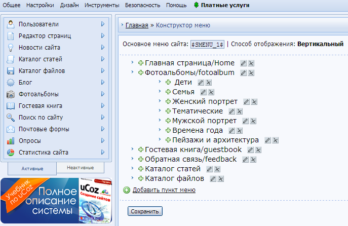 здравствуйте ! подскажите пожалуйста мне, чайнику))) в "конструкторе меню" создал подразделы для раздела фотоальбом. на странице отображается только первых два пункта. в чем ошибка?