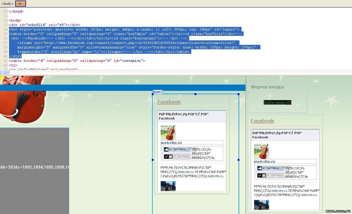 Добавлено (09 Ноя 2013, 23:58:42) --------------------------------------------- <div style="position: absolute; width: 100%; height: 100%; z-index: 1; left: 5%; top: 35%" id="layer1" align="right"> <table border="0" cellpadding="0" cellspacing="0" class="boxTable"><tr><td class="boxTitle"><b><!-- <bt> -->Facebook<!-- </bt> --></b></td></tr><tr><td class="boxContent"><!-- <bc> --><iframe src="http://www.facebook.com/connect/connect.php?id=522824824396918&connections=6&stream=0&css=" marginheight="0" marginwidth="0" allowtransparency="true" style="border-style: none; width: 230px; height: 270px;" frameborder="0" scrolling="no"></iframe><!-- </bc> --></td></tr></table></div> все где проценты подкорректируйте под сайт, писалось "на угад" без тестирования - заранее сохраните (родной)текст в исходном документе Добавлено (10 Ноя 2013, 00:04:24) promalp-forum.com