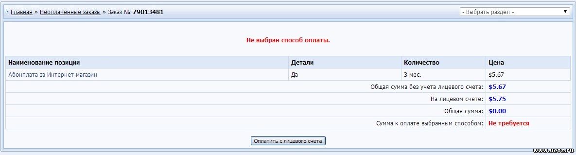 Здравствуйте! Не проходит оплата модуля интернет-магазина с лицевого счёта. Пишет "Не выбран способ оплаты", а в поле "Сумма к оплате выбранным способом" надпись "Не требуется". На лицевом счёте средств достаточно для оплаты модуля интернет-магазина. Счёт висит в неоплаченных, модуль интернет-магазина не работает. Что делать и как быть?